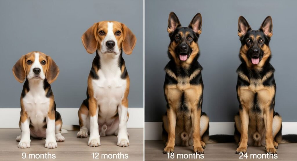 Small breeds stop growing by 9–12 months. Large breeds can take 18–24 months to fully mature.